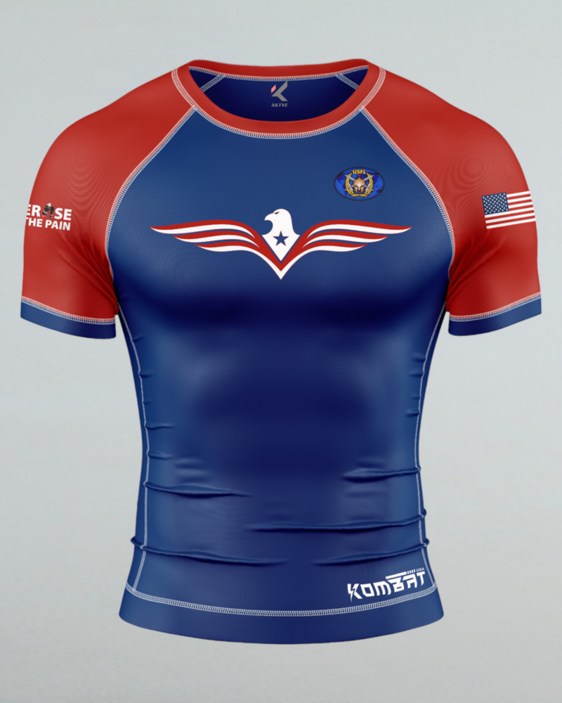 USAMMA kids rash guards comprise a perfect blend of polyester and spandex making it lightweight yet breathable. Our kids BJJ rash guards have improved fabric and coloration with the sublimated graphics. The logo printed on the youth BJJ rash guard does not crack and fade away after several machine washes. Kombat USA youth Jiu Jitsu rash guard is IBJJF acceptable for no-gi BJJ or any other MMA tournaments. This short sleeve compression kids BJJ rash guard with anti-slip waistband avoids riding up, improves blood flow enhancing movability and recovery. Wear our kids Jiu Jitsu rash guard and enjoy comfort, durability, and improved performance on the mat.